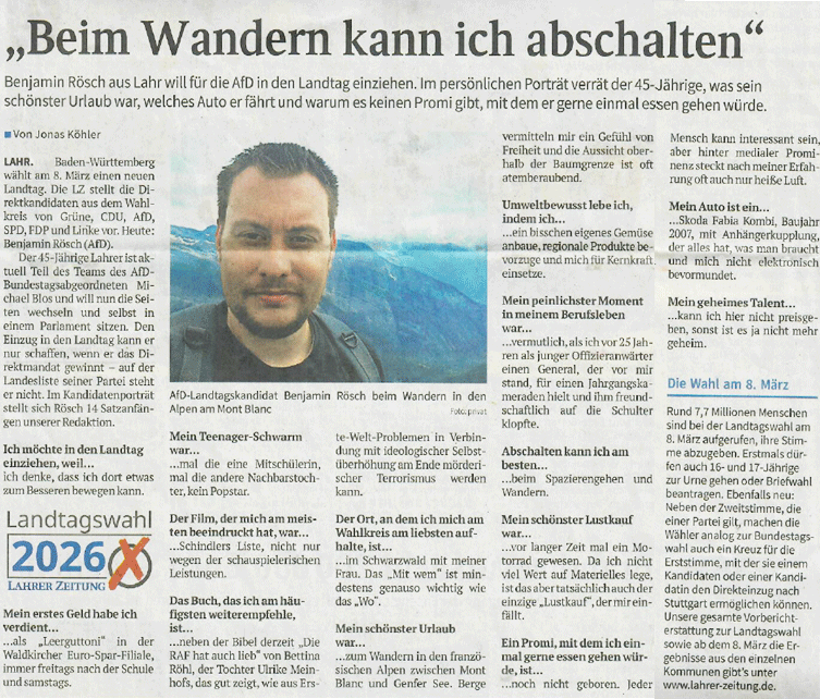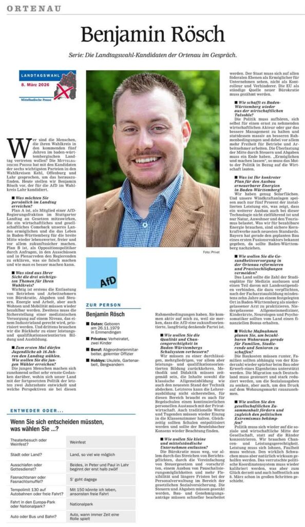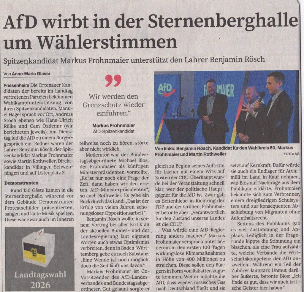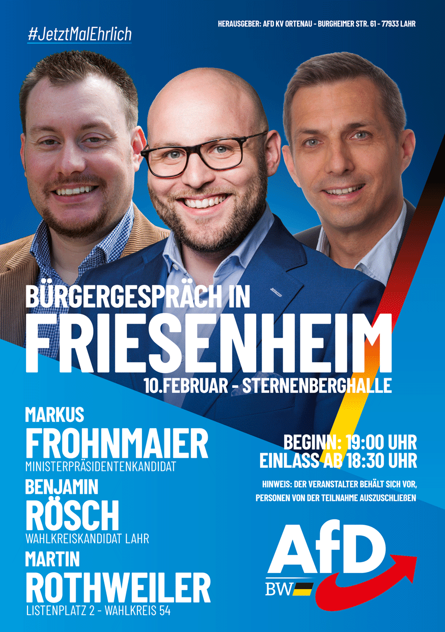 Am 10. Februar wird es in Friesenheim in der Sternenberghalle eine ganz besondere Veranstaltung geben: Als Wahlkreiskandidat und Kreissprecher darf ich unseren Ministerpräsidentenkandidaten Markus Frohnmaier MdB und den Sprecher des Nachbarkreisverbandes Schwarzwald-Baar und dortigen Kandidaten Martin Rothweiler, den viele schon als zukünftigen Fraktionsvorsitzenden im Landtag sehen, in der südlichen Ortenau begrüßen.