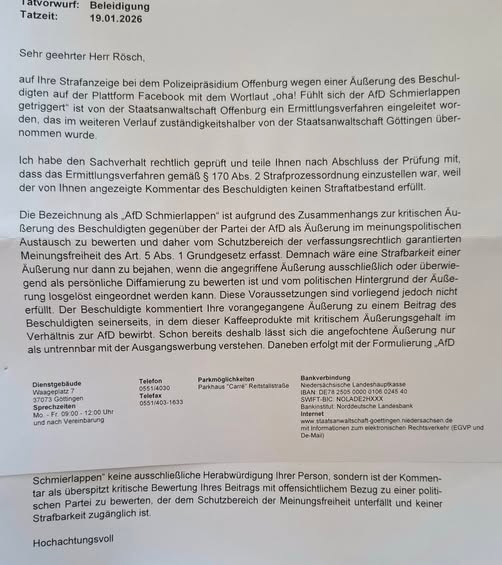 Chapeu an die Staatsanwaltschaft Göttingen, die sich, anders als ihre Kollegen in Bamberg und anderswo, so klar für die Meinungsfreiheit einsetzt, auch wenn ein durch §188 StGB besonders geschützter Politiker wie ich, als „AfD-Schmierlappen“ bezeichnet wird.